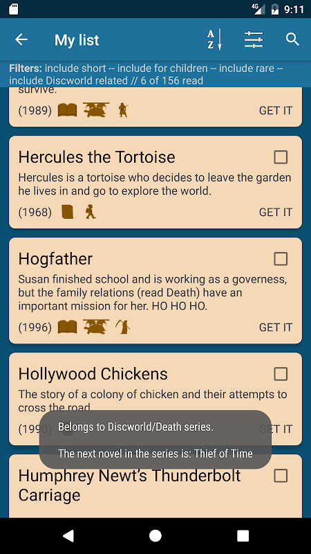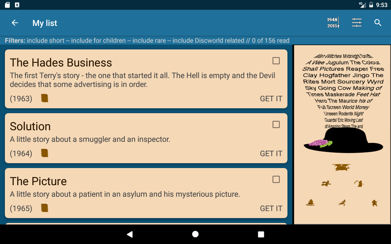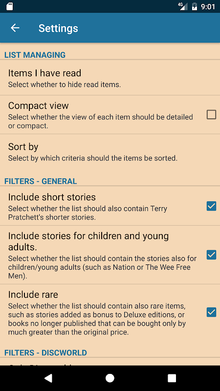 You can choose whether to include the short stories, stories for children and young adults, rare works no longer being reprinted or if you want your list to contain only the Discworld connected items. You can further to hide read items or simply make them less highlighed and sort the items alphabetically or by the publication year.