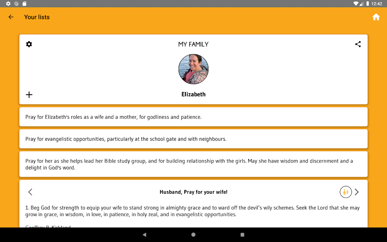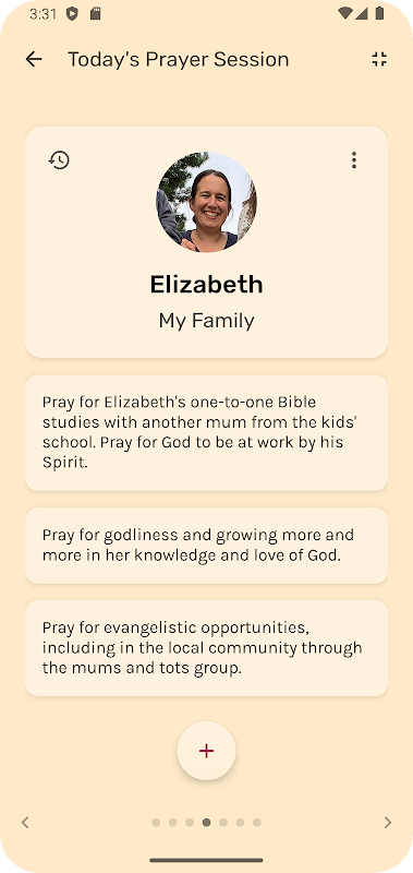 Every day, Prayer Mate will select a person or topic that you've entered from each of your main categories (perhaps "My family" or "My small group at church") and show them to you as a series of index cards - then just swipe between them to pray.