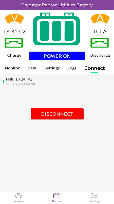 Once connected, the top section of the screen shows the current battery status including voltage & current flow, and allows you to switch the battery ON and OFF