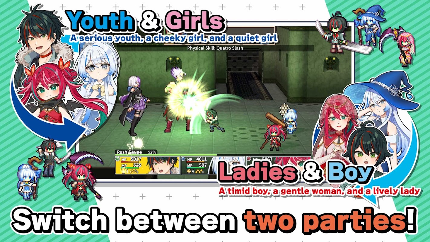 Alter your team in turn-based battles between adult and child states to alternate between attack or support types! Utilize a wide range of formations and elements, including equipment and passive skills, to strategically navigate battles.