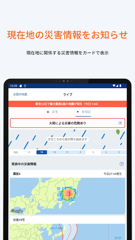 Supports various disaster information and evacuation information such as earthquakes, tsunamis, typhoons, heavy rain, and eruptions.