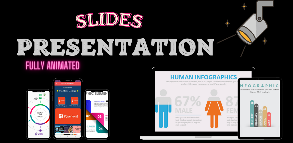 The application Presentation Slides have more than 50 templates much of them are animated and can be used easily in power point software and googleslides , the reason is the slides can be shown in your device without any other application as a googleslides file and it can converted to from powerpoint to google slides and vice versa .