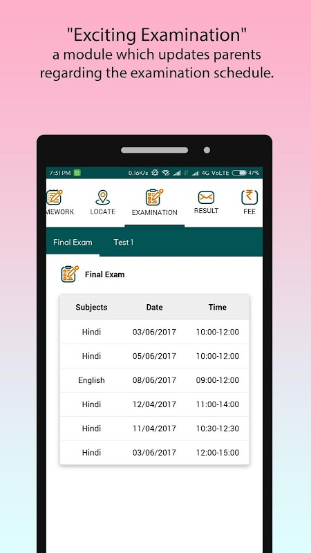 "Exciting Examination" a module which updates parents regarding the examination schedule.