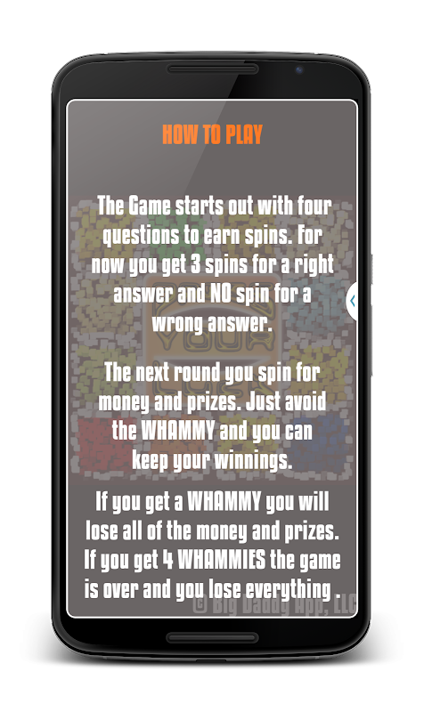 Press Your Luck, Designed after my favorite TV game show when I was growing up. The online versions are drawn out with things other than Game Play, so I'd figured I'd build my own. Answer questions to earn spins. Spin to win big Prizes and money. Avoid the Whammy. Have Fun. Keep checking back for up dates.
