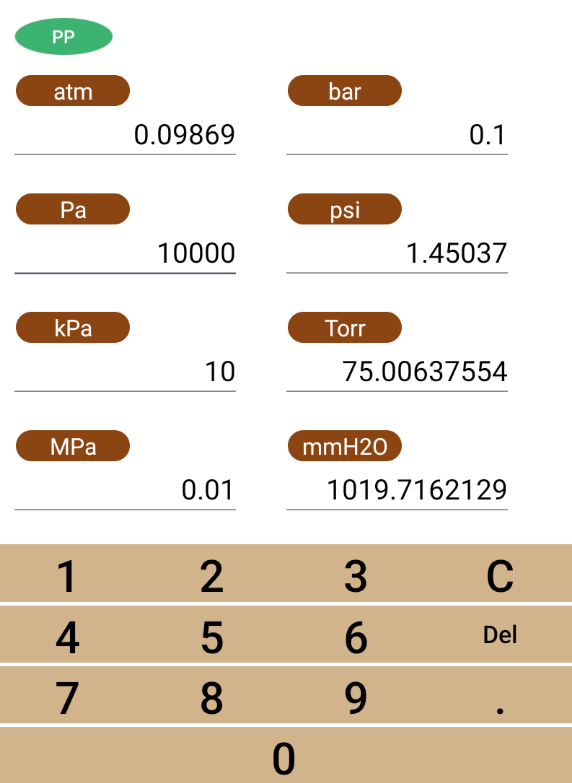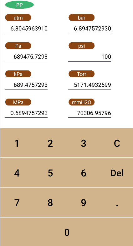 This app converts pressure units atm, bar, Pa, kPa, MPa, psi, Torr, mmH20 into other units.