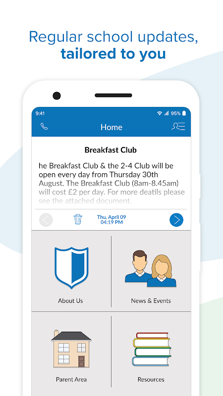 The app provides a set of content areas that the School can use to publish key information content such as school policies, educational materials, timetables, canteen menus, etc.