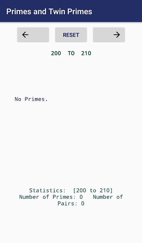 Besides getting the expected list of primes and pairs of twin primes, forward and backward navigation is also possible. The application also presents a count of primes and pairs of twin primes within the range.