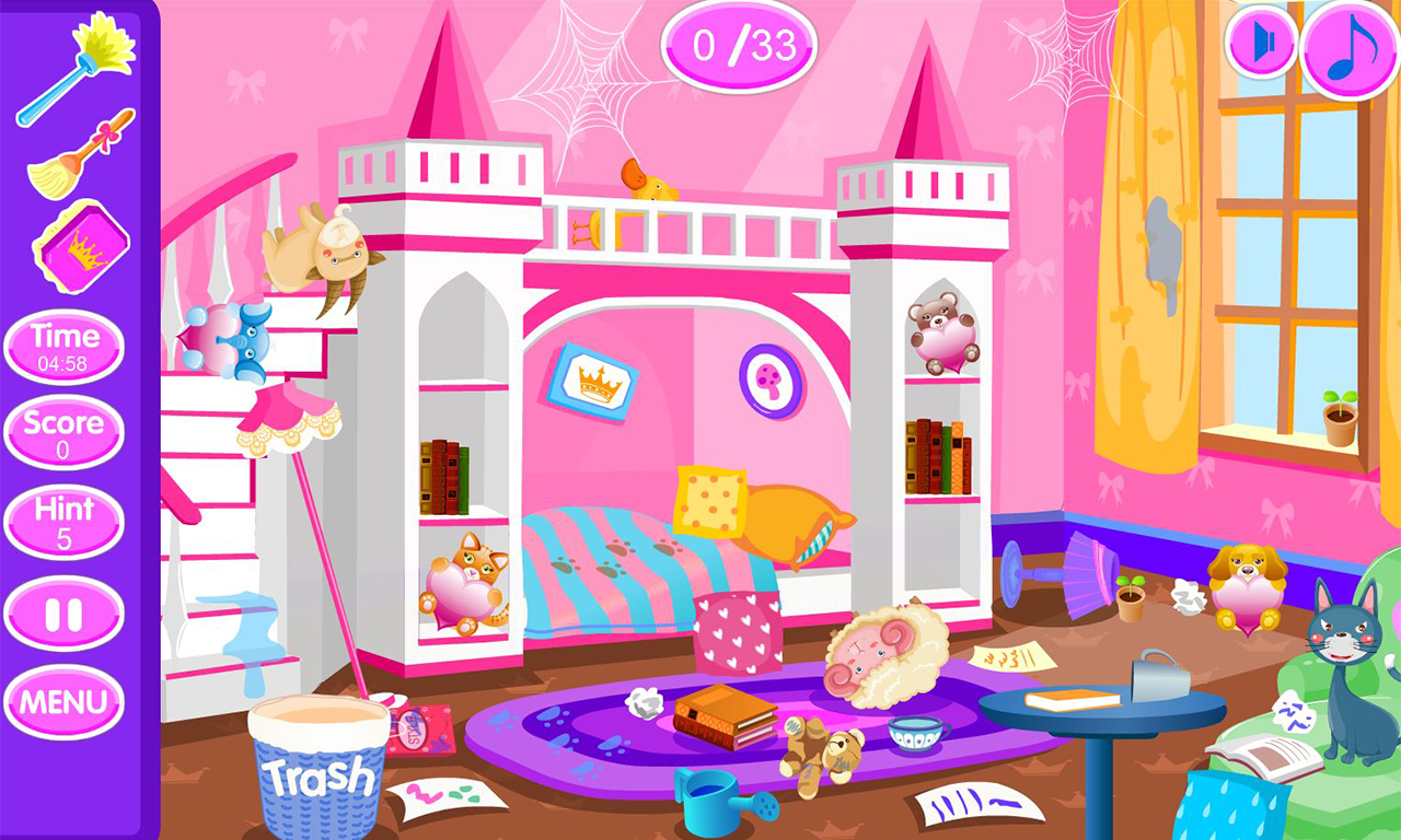 When working for royalty sometimes they can be messy especially when it comes to a princess. With this little princess cleanup game you can have fun cleaning up your princess’s room or your castle ready for her return. Here you can straighten the furniture, lights and wall hangings, clean the cobwebs, rearrange her dolls and other items, as well as throw the rubbish away, scrub the stains, sweep the floors and so much more! So if you want a challenge and test your cleaning skills, why not have a go with this princess room clean up game and see if you have what it takes to work for royalty.