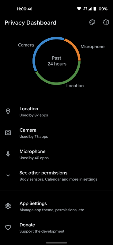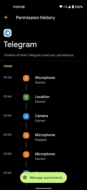 App has simple and clear timeline view of accesses to location, microphone and camera.