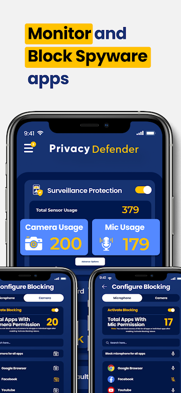 * Anti Spyware - Anti spy provides privacy protection from Spywares from stealing personal and financial data and from listening in to the conversation by monitoring and blocking camera and microphone.