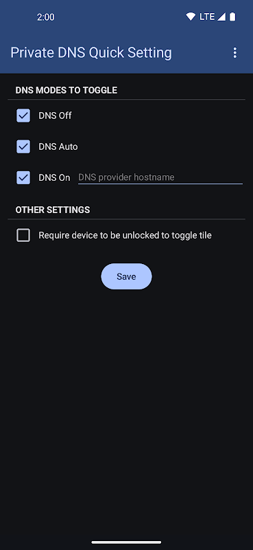 Configure your preferred DNS modes to toggle in app and toggle your Private DNS mode from your quick settings panel.