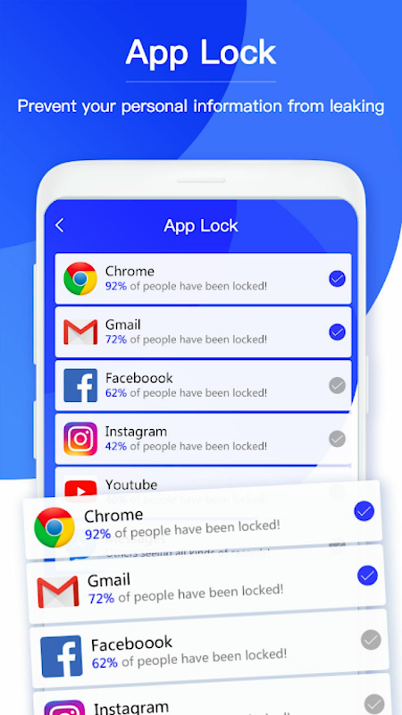 Use Smart Applock function to lock apps to Protect privacy with password, pattern, fingerprint lock.