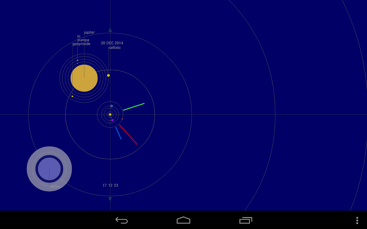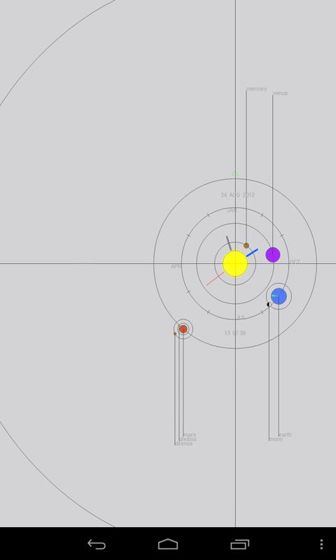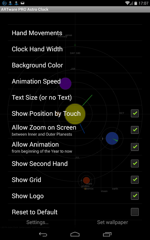 The ARTware PRO Astro Clock is a Live Wallpaper clock and a real time simulation of our Solar System, including the Rocky Inner Planets (Mercury, Venus, Earth, Mars), the Gas Giants (Jupiter and Saturn) and the Ice Giants (Uranus and Neptune) all to scale for size and orbits. The moons of Earth, Mars (Phobos and Deimos) and Jupiter's Galilean moons () Io, Europa, Ganymede and Callisto) are included too without being to scale. The orbit and planet size are not in the right relation or most of the planet would appear as small dots. Beside being a clock with date display the app is very educational in showing the solar system with planets and moons in relation to the Earth moving through the year in real time. At each full hour an animation of the planet movements since January is shown.(it will take a few days after New Year to become obvious). Great for children, students and adults with an interest in astronomy or people that just want to know where they are in space at any time.