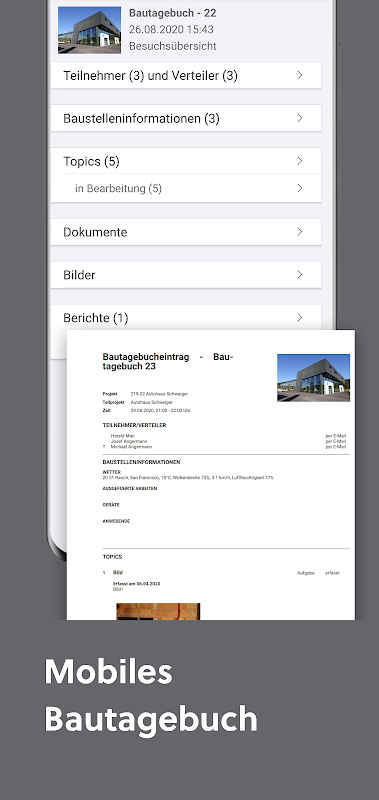 You update local weather conditions automatically via geolocation. Those present are quickly added from the list of participants. Construction status, construction process and construction measures result from the 'Topics'.