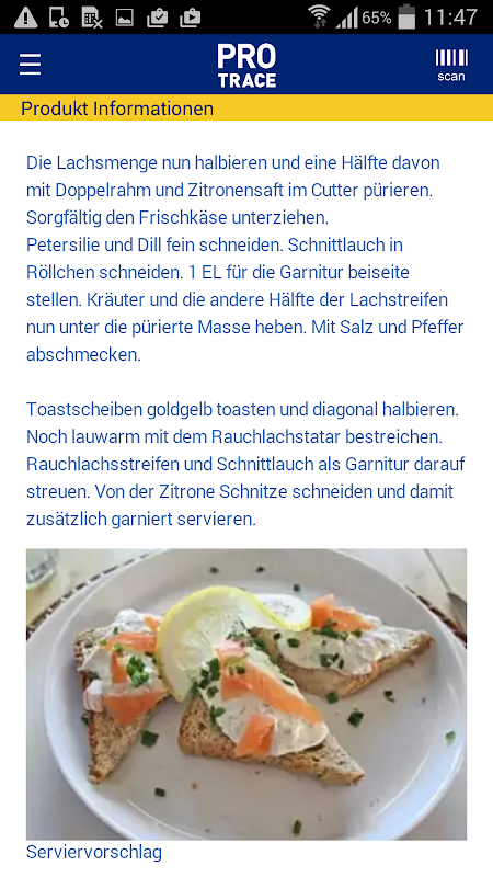 The ‘PRO TRACE' App allows you to trace a number of our products along the supply chain. By scanning the code you can retrieve information about where the product comes from, how it was processed, quality and sustainability information, and even recipe ideas. Currently we have various fish and meat products in our traceability solution for you to explore; many more will follow.