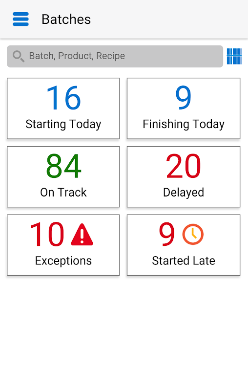 - Search batches and steps or barcode scan to view progress (on track, delayed, exceptions, started late)