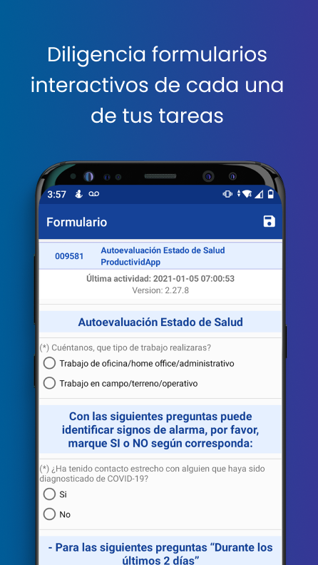 ProductividApp is a tool with a WEB component and a MOBILE one that helps companies not only to reduce their rate of work accidents but also to increase the productivity of their workforce, supporting the integration of the operation in the field with all the processes of safety and health at work, always under the premise: