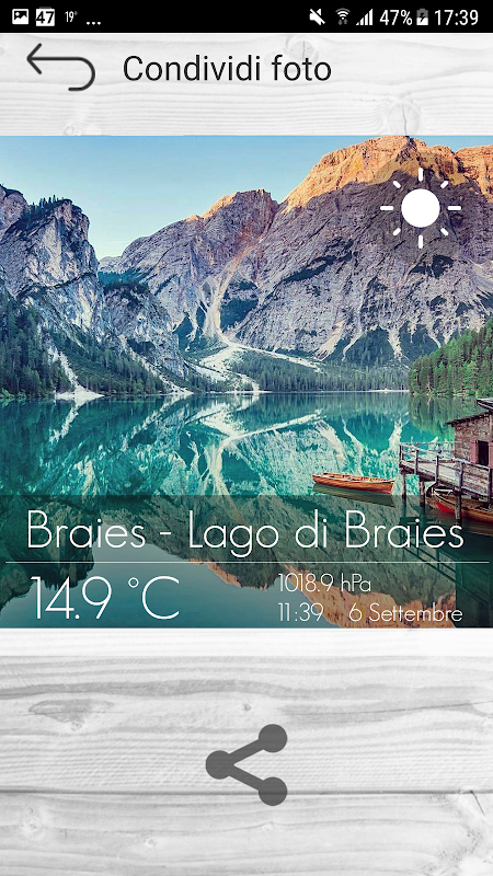 Very interesting is also the possibility to take a photograph with the weather data superimposed and some effects that can be activated in certain weather conditions and share them with the most famous social networks: facebook, whatsapp, instagram, email etc.