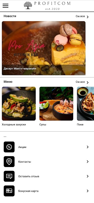 The mobile application for the "Profitcom" restaurant network, which includes restaurants in Kaluga - Pro Azia and Pro ITALIA, serves to inform customers about Promotions, News, Prices in a timely manner, as well as to book a table in a restaurant.
