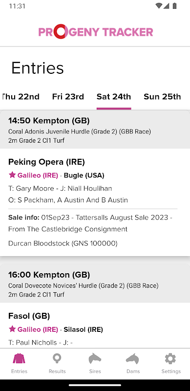Progeny Tracker is the first horse tracker of its kind and brings a unique new product to the bloodstock industry. The Progeny Tracker allows you to track unnamed horses by tracking any sire and dam in the world. The app notifies you of any runners by your tracked sires/dams and full racecards are visible within the app, along with in-depth horse profiles detailing race record and pedigree. The app also brings you sales information for all progeny of your tracked sires/dams. The app is perfect for tracking young horses sold at the sales (by tracking the dams) and for keeping up-to-date with the progress of first season sires, and much more. The Progeny Tracker app is brought to you by Racing Post Bloodstock and sponsored by Goffs.