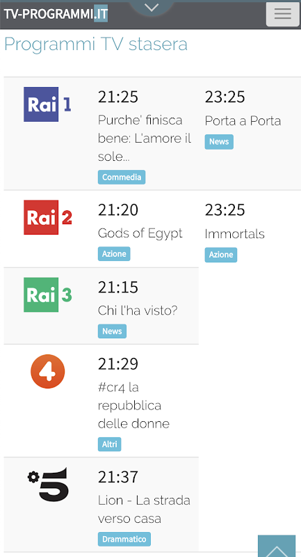 Free TV Guide of the main Italian TV channels (Digital terrestrial, Sky, Mediaset Premium, Rsi).