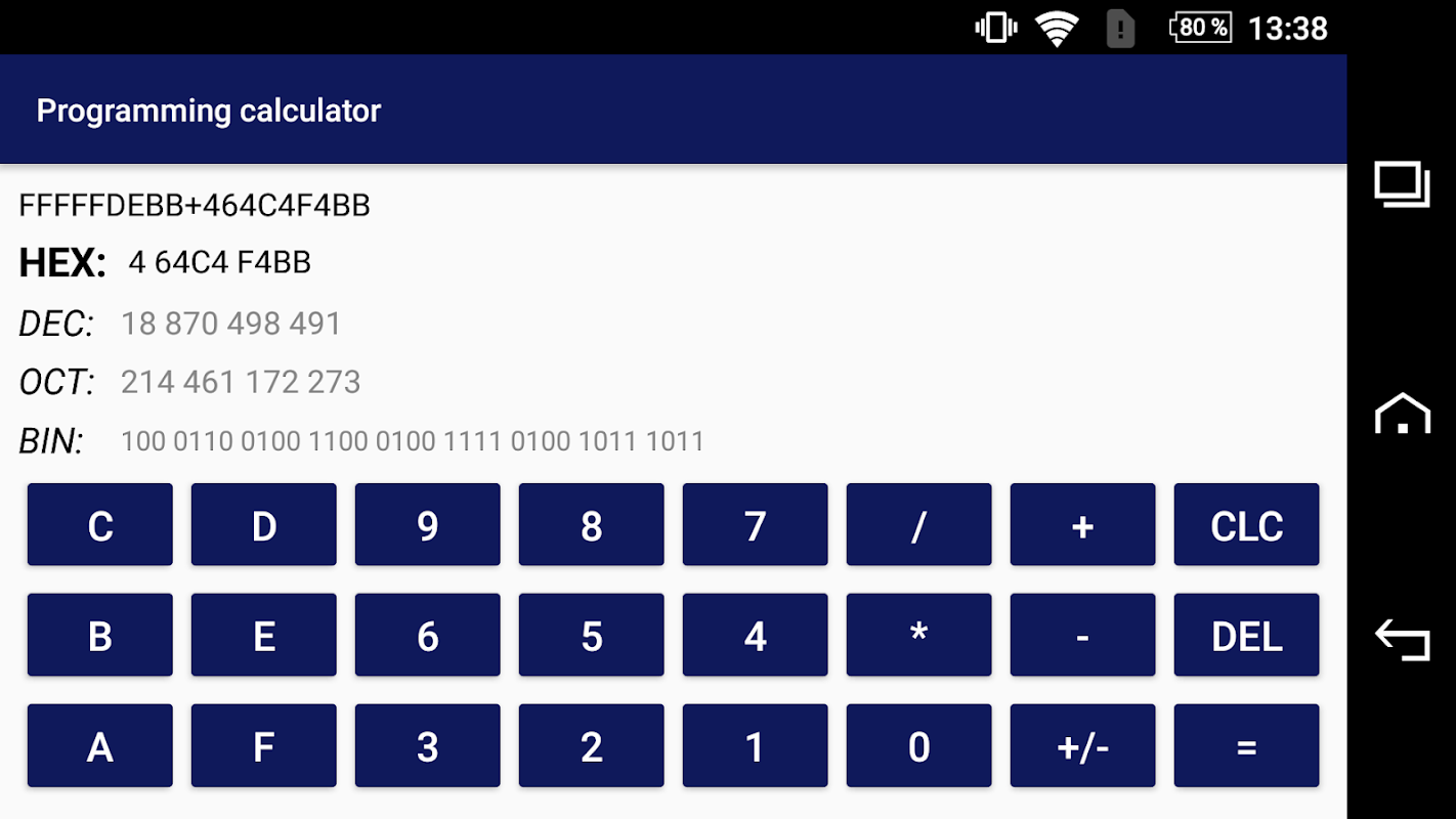 Enjoy one of the best programming calculator on Android platform! You can calculate in four numeric systems and transfer numbers between them. Supports DEC(10x) HEX(16x) OCT(8x) and BIN(2x) numeric systems. Very simple interface can make you calculations really comfortable and quick. Are you an IT engineer? This calc is what you need.