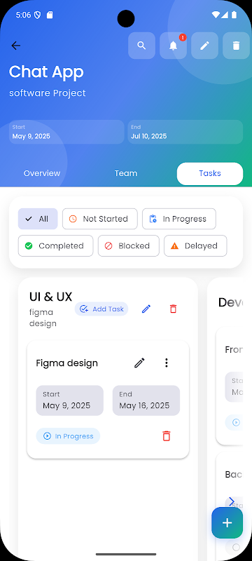 Task Management: Add, edit, and track tasks within each project part. Set deadlines and monitor task status with our intuitive status system (Not Started, In Progress, Completed, Blocked, Delayed).