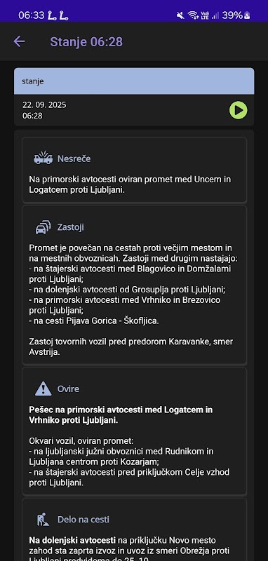 The Promet+ app allows you to be up to date with the current situation on all important roads in Slovenia. The app includes updated traveler times and traffic density, traffic news, traffic cameras, rest areas and their offer. It is designed for drivers to use it safely in their vehicles while driving. For an uninterrupted and safe driving experience check out the useful information concerning tolls and road passes. Check your route and live information on the up-to-date map of Slovenia. The source of information is national Traffic Information Centre.