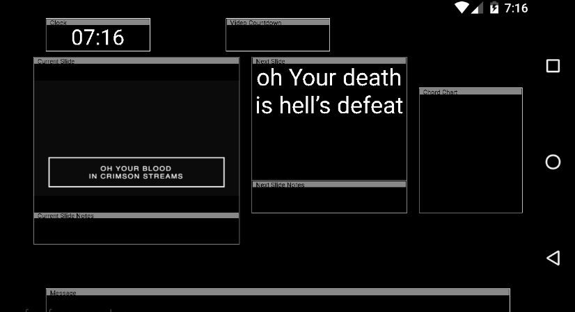 You can select any of the stage layouts that have been created in ProPresenter or follow the layout that is active in ProPresenter. The view updates as close to real-time as your network allows. We recommend using a closed network to guarantee the best experience.