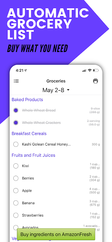 • Get a complete grocery list with the amounts you need to follow your plan