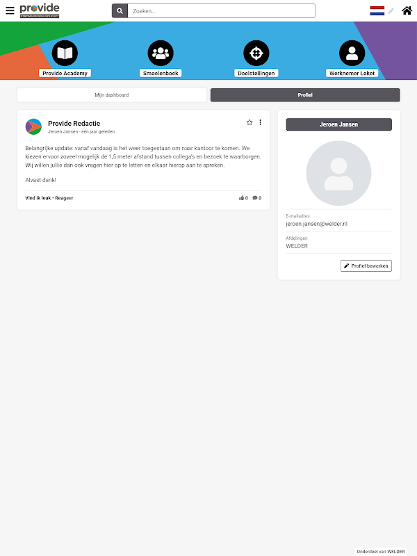 The Provide app; the online platform for you to easily and quickly share new knowledge, ideas and successes with your colleagues. Thanks to handy features such as a timeline, event calendar, groups and special community promotions, you are informed in real time about everything that happens at your employer. Thanks to push notifications, you are reminded of reactions from your colleagues, but also of tasks that you have to do. Think of preparing your performance interview or following up on agreements made for your development plan. All aspects of an innovative progress meeting are discussed; your competences, ambitions, training and objectives. Working on your personal goals is easily integrated into your daily work. All new colleagues receive a digital induction program via the app, departing employees an exit analysis. And a nice knowledge quiz or product training is regularly presented.