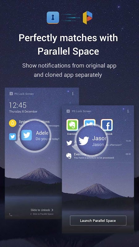 PS Lock Screen is a convenient tool for lock screen messages and notifications which perfectly matches with Parallel Space.