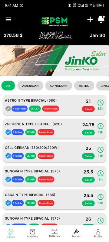 PSM offers a market rate feature, providing real-time updates on the prices of various solar products. Users can also bid on different listings, allowing for competitive pricing and greater flexibility in transactions.