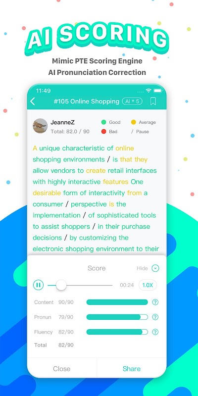 APEUni APP simulates the real PTE scoring system. It can accurately judge pronunciation, fluency of all speaking question types, and give alerts on grammar and spelling errors for writing items.
