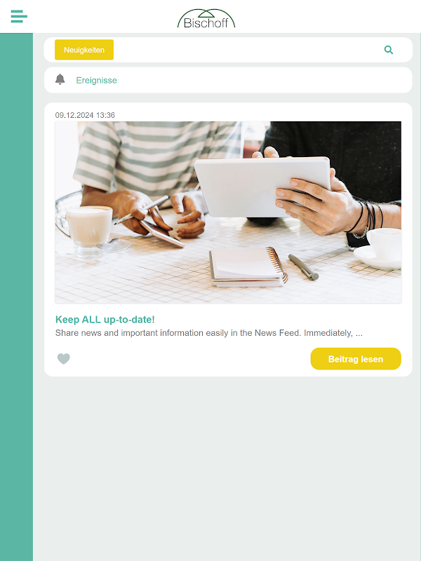 With the PTR Bischoff employee app you won't miss any exciting news from your company - basically the VIP ticket for all insider information! The PTR Bischoff app looks like your favorite social media platform - only without influencer advertising, but with real benefits. Simple, practical, brilliant! :-)