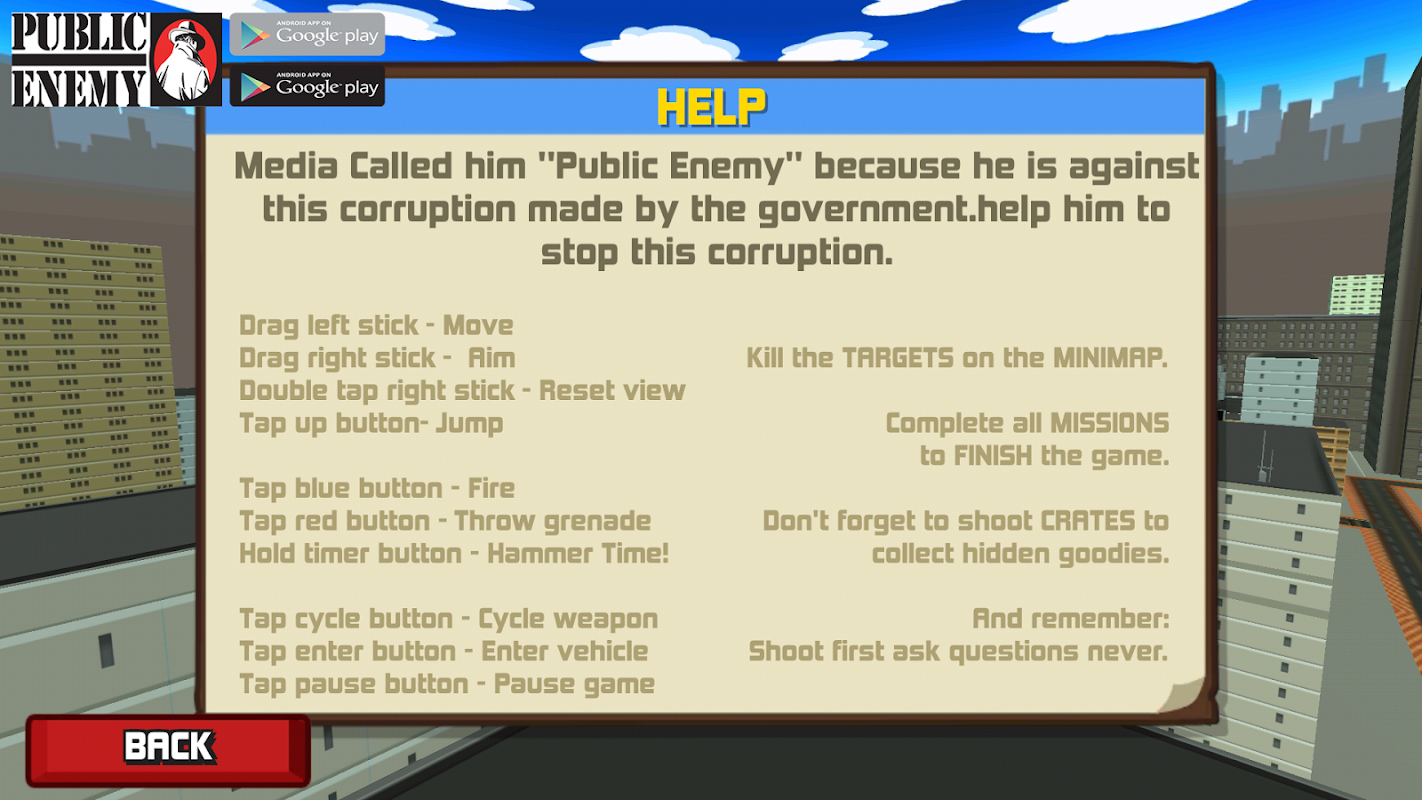 You are playing as Mister X which is known in the media by Public Enemy . He is against the corruption in his country. Take control and help him achieving his goals ...Destroy everything, enemies, buildings, vehicle and armors ... Be sure to collect as much as possible of money and health care package...
