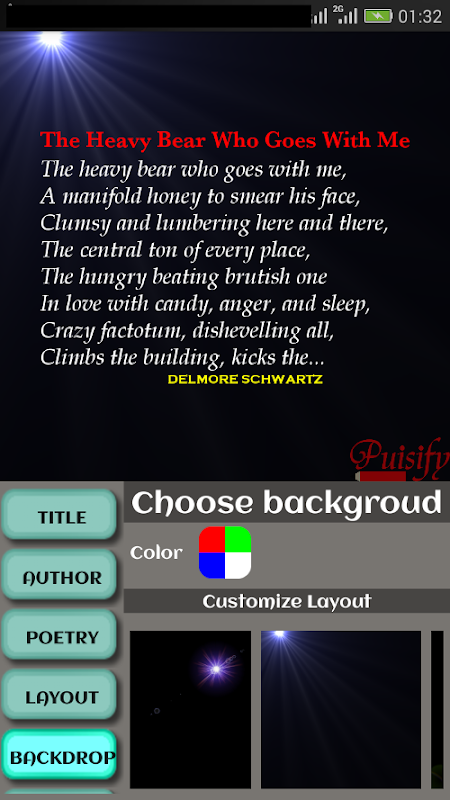 An app to create poetry that comes with exciting features. a poet can use this app to create and store his poetry collection. In addition, this application is also equipped with various background images that can be used as a background display of poetry. There is also a wide range of image effects that support transparency so as to make the appearance of poetry more illustrative. With the appearance of a background image of a poem makes the message implicit in the poem can be conveyed to the reader's understanding.