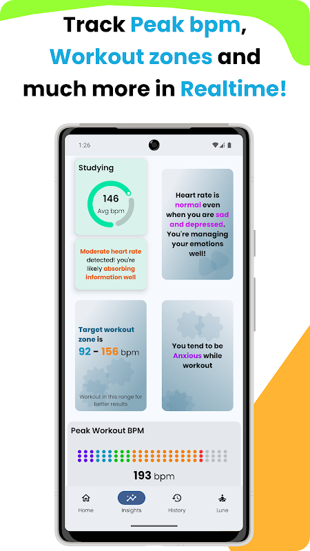 • Contactless heart rate monitoring using your smartphone camera—no need to place your finger and no need for any wearables, just your happy face!