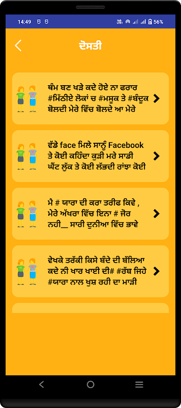 Punjabi shayari app is specially create for Punjabi’s lives in Punjab and worldwide So that they can in touch with his/her culture, In this app you will get all new shayari everyday and you can share any shayari you like with your friends.