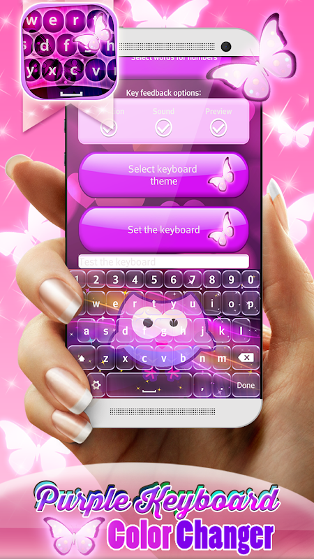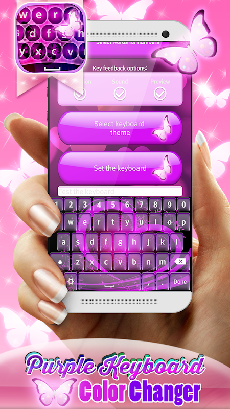 If you are fan of neon purple keyboard or pink and black keyboard, then should install our ✱Purple Keyboard Color Changer✱ best themes application, totally free of charge. Change your ''typing keyboard color'', select keyboard sounds for texting and you'll be fascinated by our virtual theme! Our designers have created the most amazing color changer app for Android, so your cool keyboard theme will be best you have ever seen! Give it a try with our sweet keyboard customizer in violet shades and you will never think of changing your keyboard skin in color of lilac!