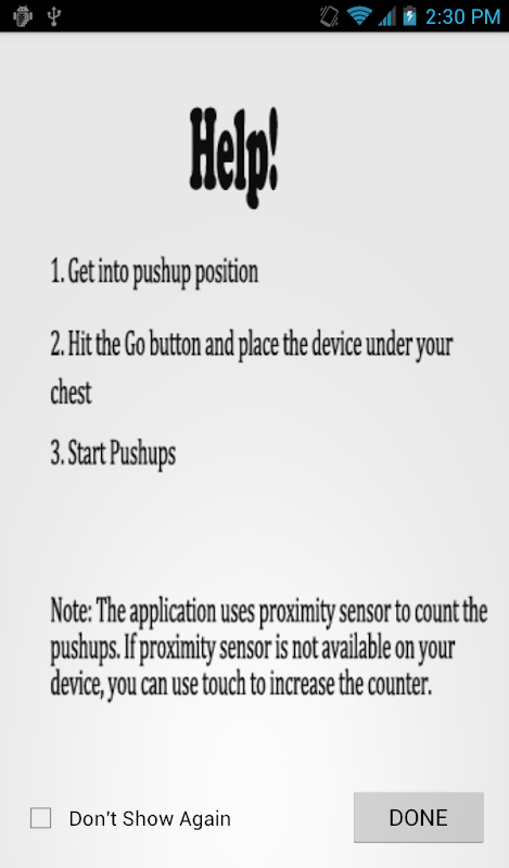 This application counts push-ups. It uses proximity sensor to count the push-ups, you just have to press the GO button, place the mobile phone under your chest and start doing push ups.