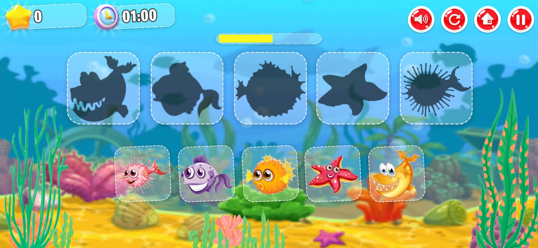 You have to guess a lot of fun fish species from their shadows. The faster you guess and match the fish correctly in 1 minute, the more stars you will collect.