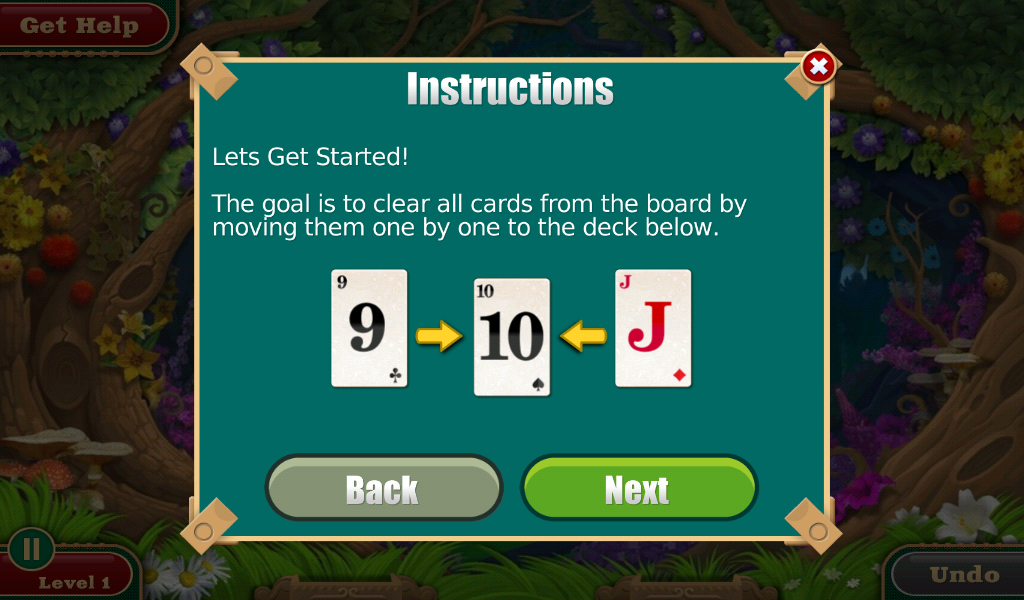 Pyramid Solitaire is a multi-deck solitaire game and great, challenging fun for the intermediate to advanced player. 100 levels provide plenty of gameplay amidst the whimsical woodland scenes. A wily knight is your suited guide through the levels as he provides tips and hints. Piles can be built down regardless of suit, but only groups of cards built down by suit can be moved together. The object is to remove all the cards from play. Customization is available for card motifs and sounds. Excellent table themes and a robust stats card round out this game.