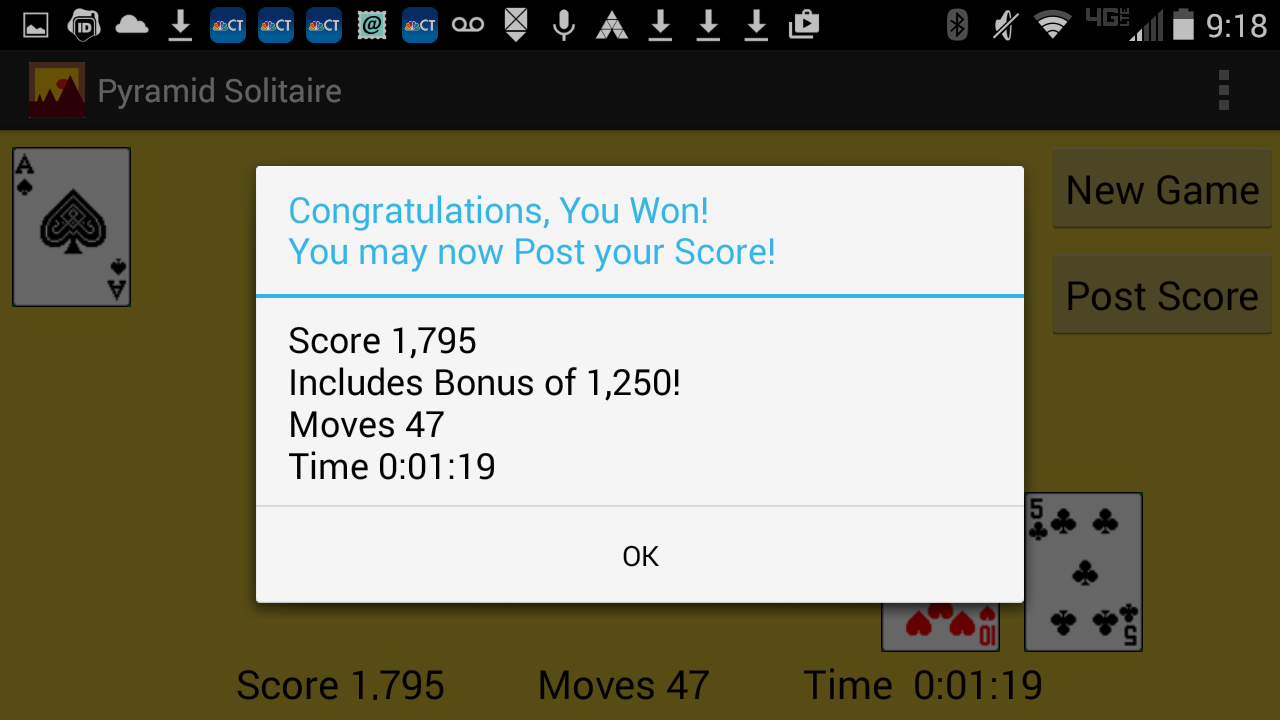 Pyramid Solitaire features 3 Leaderboards, 29 Achievments, and full Animation!