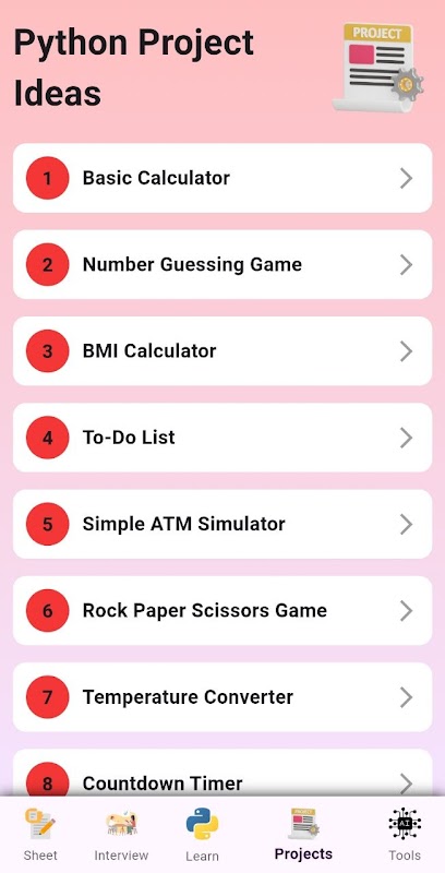 • Full Python Project Ideas with Implementations: Take your skills to the next level by building real-world Python projects. Our app provides complete project ideas with step-by-step implementations, allowing you to apply what you’ve learned and create impressive projects for your portfolio.