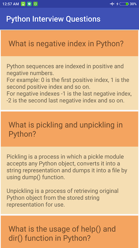 This app contains Python interview questions and tutorial with code snippets.