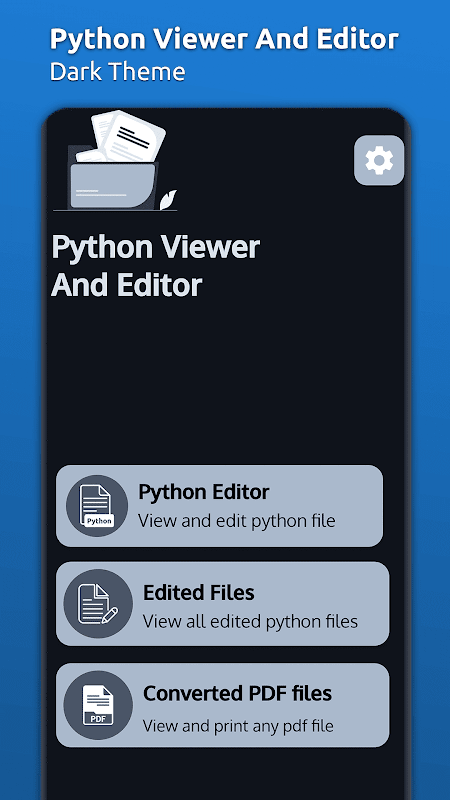 Through python reader learn python code easily. Python file viewer will list all edited python file which you can easily open in editor for further use. Python file opener also list all converted python to PDF files which you can share, delete and view it in a PDF viewer.