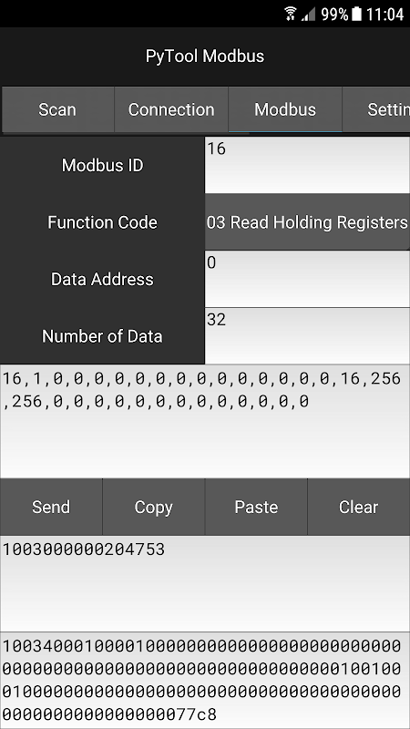 With the ability to run custom Python script, PyTool Modbus can read and parse any received data, display it in the way you want, and even act accordingly when it is needed.