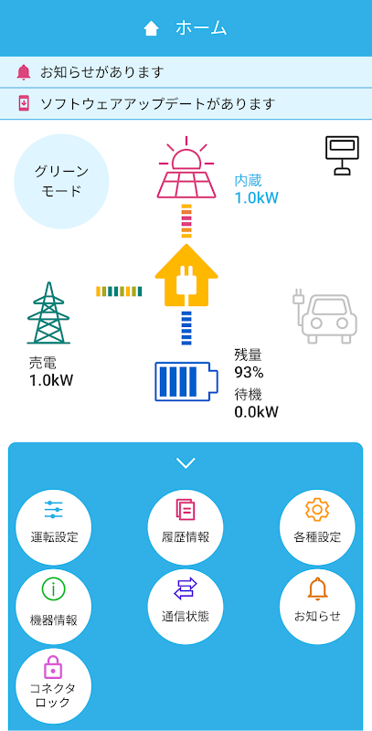 You can check the current power generation, charging/discharging of storage batteries and vehicles, remaining battery power, etc.