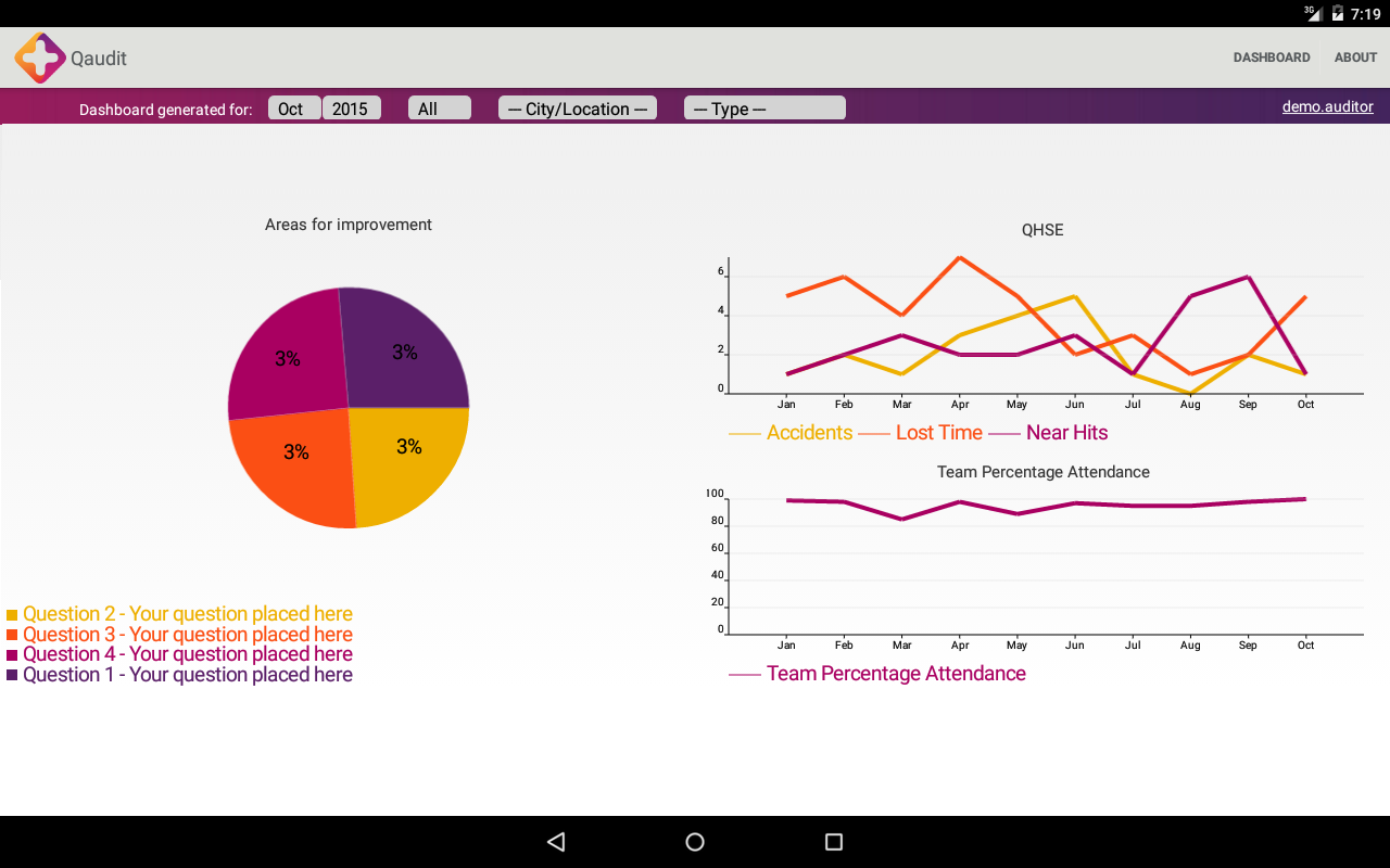 Qaudit is a bespoke audit solution built for Mitie E+. The application allows customer audits to be carried out 24/7 and in accordance with Mitie’s contractual KPIs. Qaudit has different levels of access, allowing full task control and overview. The powerful report engine and its custom visualization is a great tool for Mitie E+ and its customers. The dashboard is designed to reflect the current KPI levels and analyse the data. The system was developed to meet Mitie E+ requirements and access will be granted only to Mitie customers and employees.